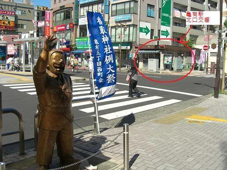 A section of the real-life Kameari, showing a bronze statue of Ryotsu and encircled, the real-life (unused) police box nearby.