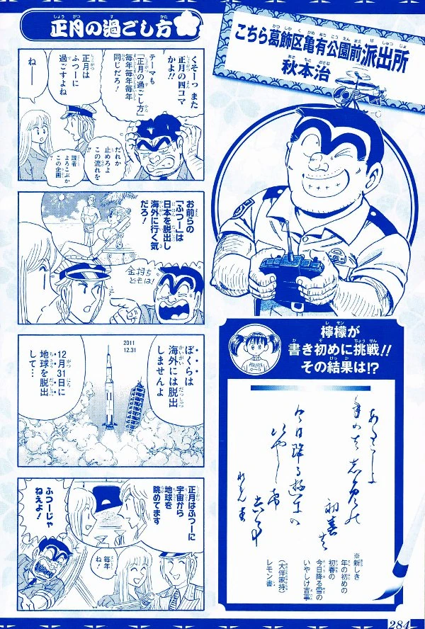 Every New Year, Jump has the artists do 4-panel gag strips with their characters. Here, with KochiKame, the gang wastes all 4 panels complaining that all they ever do in here is normal stuff.